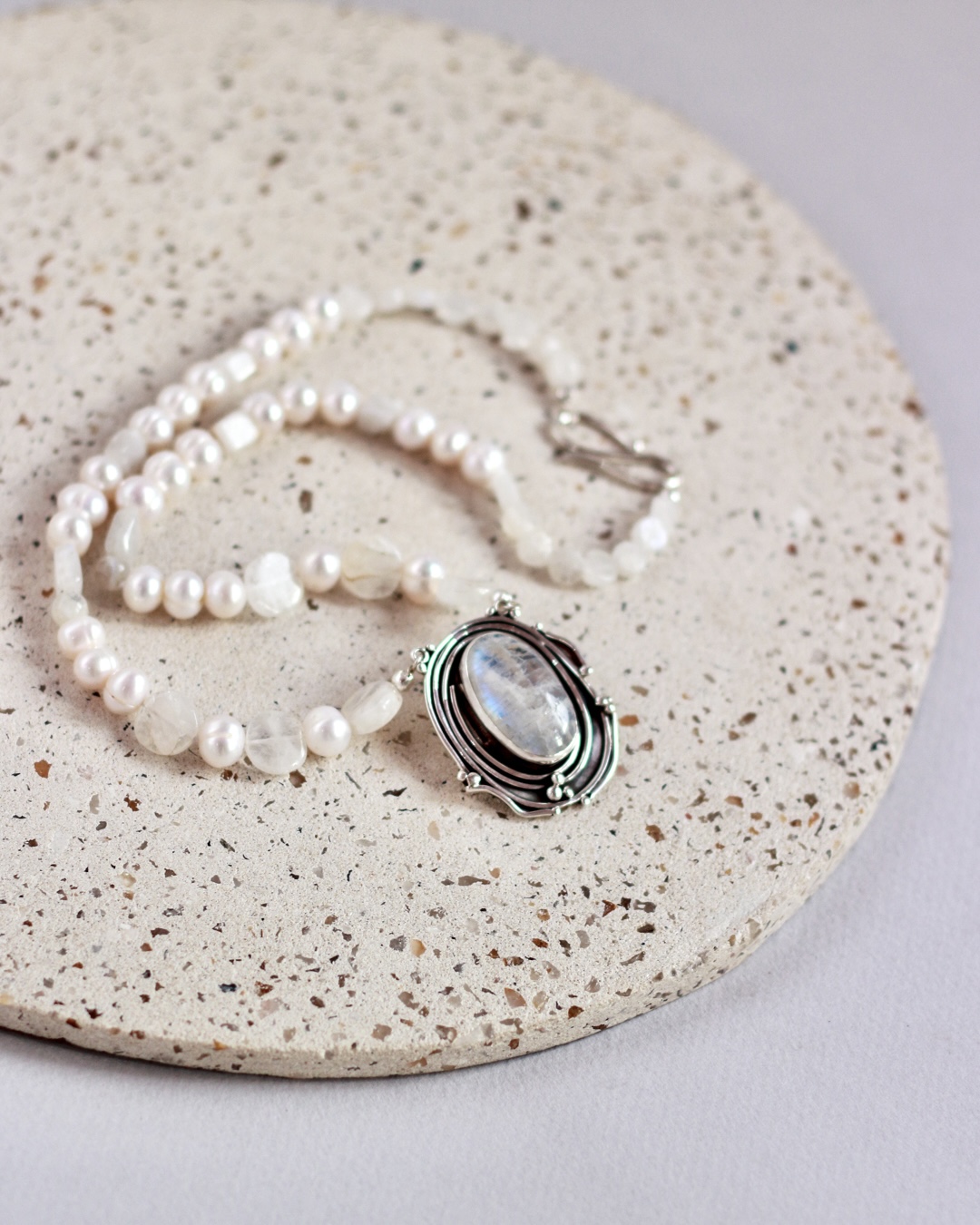 Colar de Pérolas e Rainbow Stones, com pingente de Rainbow Stones com volume. Fecho exclusivo em prata 950.